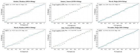 Finally, the Standardized Streamflow Index (SSI) was used for hydrological drought detection. Previous uses of this index include two streamflow indices based on the SPI-calculation procedure developed by Shukla and Wood [52] and Nalbantis [53]. For the calculation of SSI, we used the GEV distribution, recommended for this purpose [54]. Figure 3 provides exemplary probability plots for distribution fitting process for SPEI (Mendoza), SSMI (Sonora), and SSI (Maipo). Despite the huge variety of distribution functions, it is challenging to choose the most appropriate one for each month, accumulation period, and variable. Parameters in this study were obtained by probably weighted moments. We compared results of index values that were obtained by best-fit distributions against recommended ones, and found as higher the accumulation period, the lesser the difference between index results. Therefore, we calculated the indices presented in this study with recommended distributions by literature. All of the indices were calculated using the SCI-package in R [55].