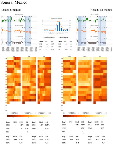 The hydrograph describes the pluvial regime of the Sonoran river basin. Main precipitation events occur in July and August, and lower precipitation events during winter months in the northern hemisphere. A strong ENSO influence on the six-months accumulation period is detected for March for all three drought indices, with highest r = 0.56 between SSMI and ENSO. Thus, an ENSO influence can be detected, although the obtained correlation coefficients suggest that other influencing factors take place as well. For instance, for the 12-months accumulation period only correlations between ENSO and SSMI are statistically significant, and no influences on SPEI or SSI are visible. Using a threshold of −1 for the SPEI values, we detect six drought events for SPEI-6, and five for the SPEI-12. Applying the same threshold for SSMI values, four drought events are found at 6-months, and two at 12-months. Detected events by SPEI do not overlap completely with SSMI detected events. By looking at the correlation coefficients between both indices, we can identify a rapid response of soil moisture to precipitation. Although significant, this relation is moderate, with the highest r = 0.47 for lag 0. The same applies for SPEI with SSI values, even though the highest r is obtained with lag-1, showing a rapid response of streamflow to precipitation, as seen on the hydrograph. SPEI and SSI resulting values highlight that hydrological drought events persist longer, indicating that longer recovery times take place. Soil moisture responds to streamflow immediately (r = 0.62 at lag-0), demonstrating that SSMI-values are linked to SSI-values as well. For example, for the drought event starting in 2009, SSMI values are constantly below average, even if SPEI values are above average at the end of 2009 for nearly one and a half year. During the same period, SSI values were below average, overlapping with SSMI values in duration and magnitude. Thus, we can argue that soil moisture is an important variable to understand drought processes within the river basin as it is correlated with ENSO and the other indices. Hence, the beginning of drought events that are detected by SPEI are similar, but the duration and streamflow and soil moisture patterns, are captured differently. This can be due to other variables, such as human influences (e.g., irrigation and water extraction). The heatmaps reflect the rapid response of soil moisture and streamflow respond to precipitation, as well as longer recovery periods.