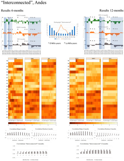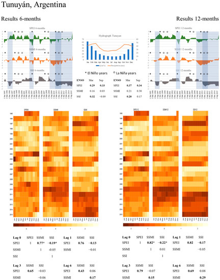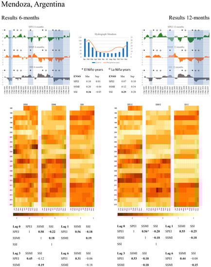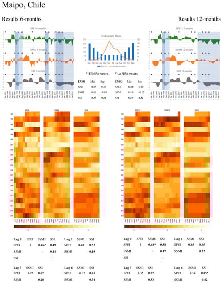 Graphical summaries were prepared to illustrate drought propagation for each river basin using the standardized indices (Figure 4, Figure 5 and Figure 6). These summary figures show results for 6- and 12-months accumulation periods (left and right respectively). A plot showing annual precipitation and streamflow patterns from observations is located in the middle upper part. Calculated SPEI, SSMI, and SSI-indices are shown for the same period (i.e., 1995–2015) to allow visual comparisons of all the metrics. Coloured bars across the indices are to exemplify drought events and their response in the other two indices, besides they highlight the uniqueness of each drought event. In the figures, we also provide a table with the correlation coefficients between the ENSO anomaly index and each drought index for March and September, and marked years of ENSO with ‘*’ for El Niño events and ‘o’ for La Niña years in the time line of the indices. Furthermore, below the plots, heatmaps of the SPEI, SSMI, and SSI are shown for the same period 1995–2015, for easier comparison of magnitudes (by colours) and durations (one line per calendar year) among the indices. Finally, the bottom part of the graphical summary shows Pearson correlation coefficients among the indices for 0-lag, 1-lag, 3-lag, and 6-lag in a matrix format: statistical significance is expressed through bold values and the asterisk symbol is used to denote maximum correlation coefficients. Additionally, Table 2 summarizes the highest correlation coefficients for all analysed indices in all river basins, and provide a first glance about propagation patterns, especially at the lag with highest observed correlation. Note that negative correlation coefficients between SPEI and SSI in the Mendoza and Tunuyán river basins are small, meaning that, in this area, the hydrological regime cannot be explained by local precipitation only. This is due to the influence of the precipitation falling on the western side of the Andes, hence precipitation patterns of the Maipo river basin have a higher influence on the streamflow of the Mendoza and Tunuyán river basin as precipitation falling within them. Further details are provided in the results section of each river basin, especially for the “Interconnected river basin” presented in the discussion section.