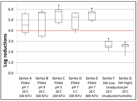 Box-and-whisker plots (min/max, lower/upper quartiles, and median) of average E. coli log10 reductions (LRs) with AQS treatment with different test waters and conditions. The asterisk (*) indicates that the mean bacterial concentration after treatment is below the limit of detection. The dashed line represents the LR default value to be considered “highly protective” with regard to bacterial removal/inactivation, as defined by the WHO [18].