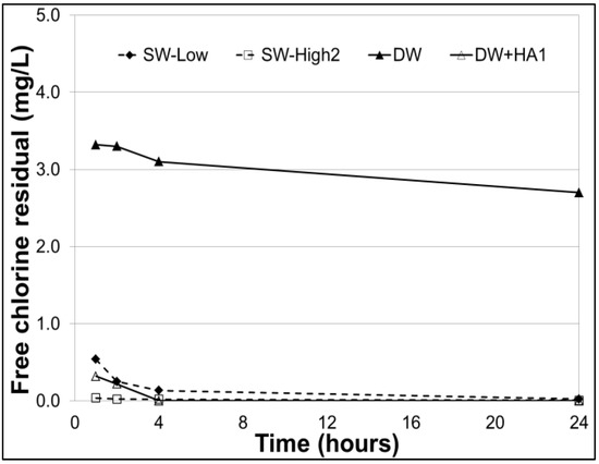Synthetic test waters (i.e., DW and DW-HA) were used in simulated storage tests (test series H and I) and in DBP formation tests. DW was the chlorine demand free water used to assess the maximum FCR attainable. Humic acid (Sigma-Aldrich) was added to DW to benchmark CDP performance if future comparisons with other products are envisioned. It was added at a concentration of 30 mg/L to make up DW-HA1 to be used in the simulated storage tests. A second synthetic test water (DW-HA2) was prepared for DBP formation tests by adding humic acid (11.5 mg/L) to DW, corresponding to a water with relatively low TOC that would still result in a 24 h FCR [23]. These synthetic test waters were prepared daily and could serve for benchmarking purposes between products.