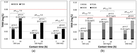 Total trihalomethane (THM) (a) and haloacetic acid (HAA) (b) formation at 2 and 24 h after treatment with AQS alongside pH and free chlorine residual (FCR) (in square brackets) at different sampling times. Dashed lines represent USEPA [21] maximum contaminant limits of 0.080 mg/L and 0.060 mg/L for THMs and HAAs, respectively.