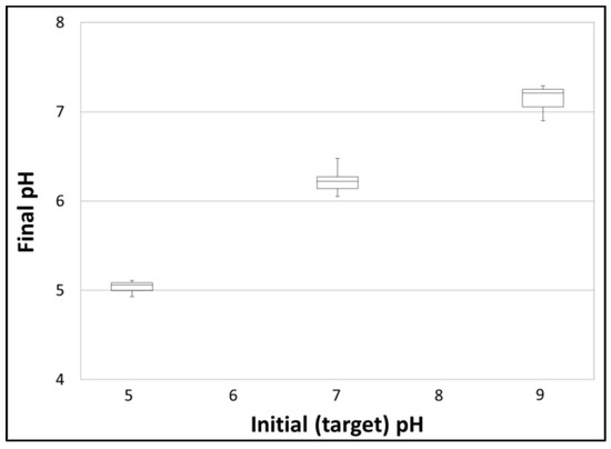 Box-and-whisker plots (min/max, lower/upper quartiles, and median) of the final treatment pHs for each initial target pH tested.