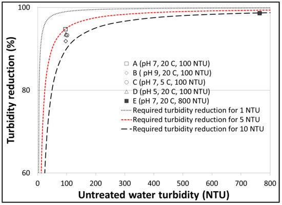 The average treated water turbidity was of 7.8 NTU with 14% of samples below the target treated water turbidity of 5 NTU. Average turbidity reduction efficiencies were between the required reductions to achieve final turbidity levels close to 5–10 NTU, except for natural surface water test series F and G, where the treated water turbidity was greater than that of the untreated waters (Table 3). Treated water turbidity levels were not significantly different (p = 0.28) between the different conditions tested (i.e., test series A–G).