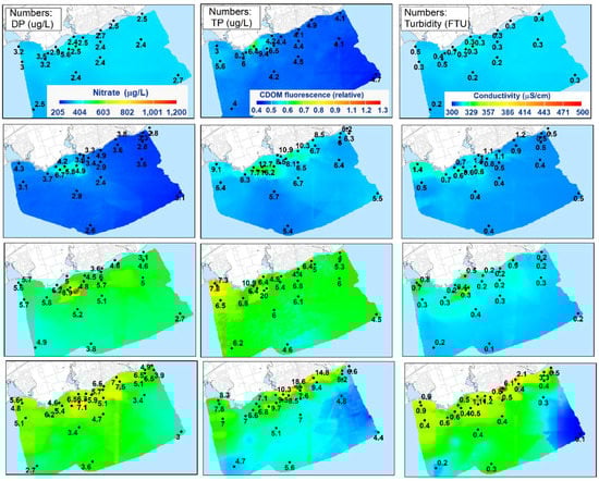 38]. At times, conductivity and CDOM fluorescence were elevated at points along the shoreward edge of the study area. Field sensor data is difficult to interpret when lakeward signals are not well captured. Nevertheless, it is clear that phosphorus concentrations were elevated along the immediate shoreline due to runoff into the lake.