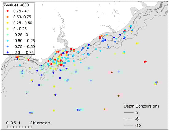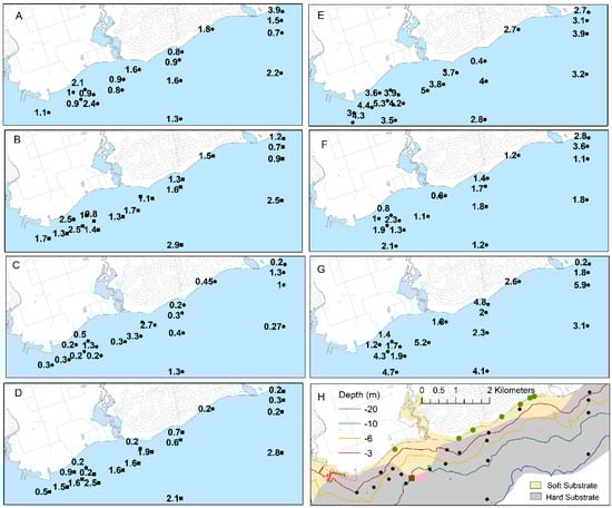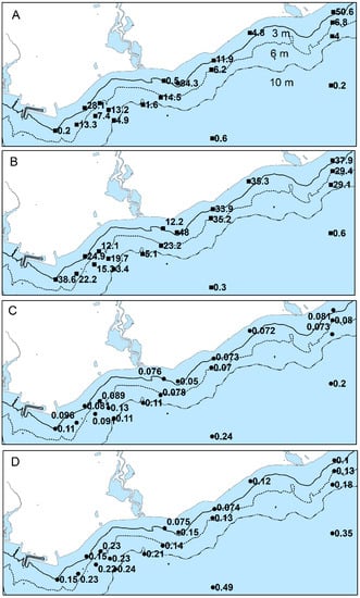 26]. Biomass was consistently high at sites WSW of the WPCP outfall, suggesting a positive effect of the proximity to the outfall. Abundance was unrelated to depth other than that it was consistently high at the two deepest sites, suggesting that physical disturbance from waves had a negative effect on abundance.