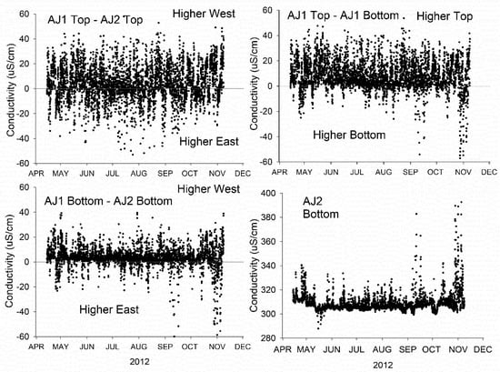 37]. However, the dimensions of the mixing areas at the lake surface could not be delineated using the field sensor data because of the interacting influence of other area loading sources. This is evident from the PCA analysis of lab-based water quality data. The third axis separated locations based on the influence of the discharge from the WPCP, yet nitrate + nitrite did not correlate strongly with the axis as contrasted with ammonia + ammonium, TP and DP. This suggests that enrichment of nitrate + nitrite is less specific to loading from the outfall than ammonia + ammonium. The field conductivity and CDOM fluorescence also depict mixing areas in the vicinity of the WPCP diffuser but the spatial patterns are also influenced by other discharges along the shoreline.