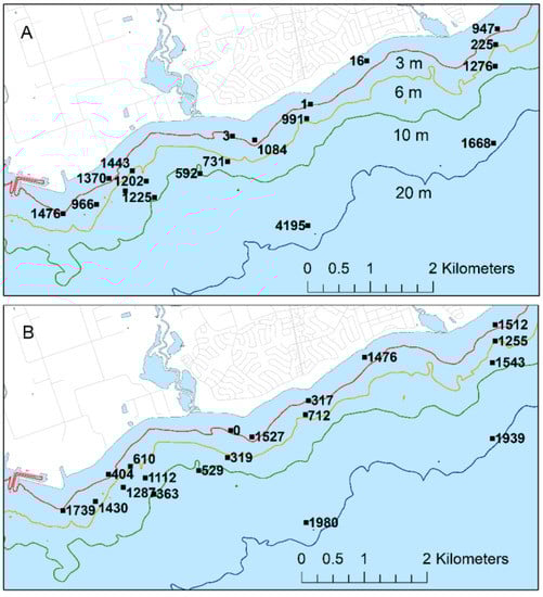13]. Phytoplankton levels in the nearshore are generally low. In recent years there have not been water-column algae blooms in this region of the lake. Lake-wide spring total phosphorus (TP) concentrations when the lake is mixed have declined over the last 35 years subsequent to phosphorus controls in the 1970s, albeit more slowly in the past 20 years. Recent levels range from 5 to 7 μg/L indicative of oligotrophic conditions [