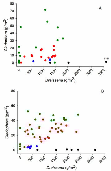 The possibility that internal phosphorus loading facilitated by Dreissena adds to, and obscures, local-area phosphorus loading, contributing to the growth of Cladophora, is neither supported nor well resolved with the data here. The weak association between Cladophora and Dreissena biomass, the absence of spatial association between Cladophora biomass and areas of nutrient enrichment, and in consideration of the sheer abundance of Dreissena and a growing literature that indicates that Dreissena affects lake nutrient pathways suggests that efforts to manage Cladophora in areas with nutrient pollution be mindful of possible interactions with dreissenid mussels.
