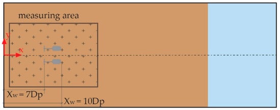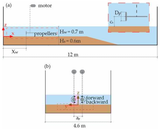 Experiments were conducted in the Marine Engineering Laboratory at the UPC-Barcelona Tech University in a medium-scale water tank named LaBassa []. Figure 1 presents a sketch of the tank, where is the diameter of the propellers, is the clearance distance between the center of the propeller and the sediment bed, is the distance between the propeller plane and the front wall, and is the distance between the center of the two propellers.