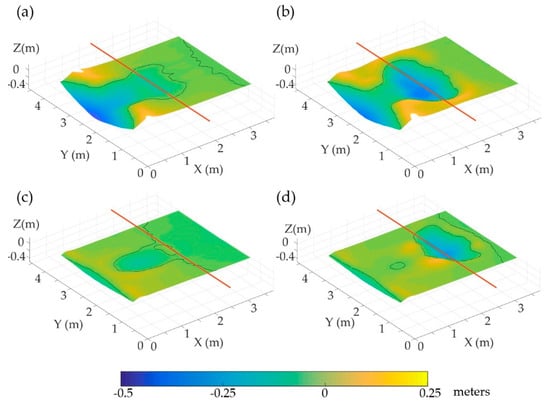 Sediment bed scanning results after 30 min of propeller run. Black lines represent z = 0. Red lines indicate the position of the propeller planes. (a) T1-fwd, n = 400 rpm, (b) T1-b&f, n = 400 rpm; (c) T4-fwd, n = 300 rpm; (d) T4-b&f, n = 300 rpm.