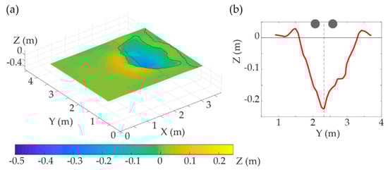 Transversal profile of T4-b&f, n = 400 rpm, t = 5min. (a) 3D scan of the sediment bed. Red line: transversal profile located at x = 2.5 m; (b) Transversal profile. Dashed line: symmetry plane between propellers. Gray ellipses: distorted sketch of the propellers using real location with respect to the y axis.