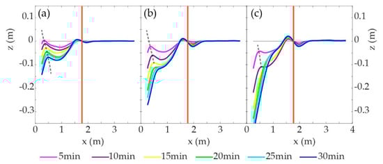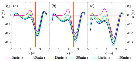 In the case of forward tests, the time evolution of the longitudinal profile located at the centerline between the propellers, plotted in Figure 5, helps to understand the merging of the eroded area at the harbor basin and the eroded area close to the toe of the wall, outlined previously. For low-speed revolutions (e.g., 300 rpm, Figure 5a), the scouring profile retains a clear distinction between the two scouring areas. When the revolution speed increases, Figure 5b,c, the separation between the zones is not maintained over time and disappears after 15–20 min of the experiment. After this stage, the erosion at the vicinity of the docking wall dominates the profile.