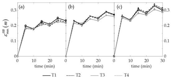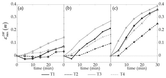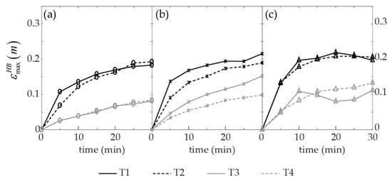The significant decrease in of T3-fwd-400 rpm, Figure 6c, is caused by the merging of the two scouring areas already discussed at the beginning of this section. In fact, the results of maximum scouring depth at the harbor basin, , are obtained from the centerlines plotted in Figure 5c, where the centerline behavior changes substantially after a 15 min run (yellow line). This also occurs for T1-fwd-400 rpm, Figure 6c, after 20 min, but at smaller magnitudes.