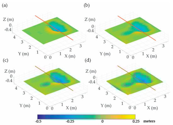 At each test, a scan of the measuring area yielded results like the example shown in Figure 3. Upper plots (Figure 3a,b) represent the situation where the propellers are closer to the sediment bed () and to the front quay wall (). On the contrary, Figure 3c,d, shows the opposite conditions, with the propellers further from sediment bed ) and from the front quay wall ().