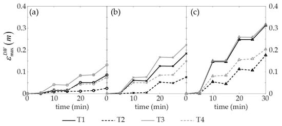 When looking at the effects of the returning flux at the toe of the vertical wall, , Figure 11 plots the maximum eroded depth at the intersection between the sediment bed and the docking wall. In this case, contrary to what succeeded in the forward scenarios, the maximum eroded depth at the toe of the wall is smaller when compared to the maximum eroded depth at the harbor basin area, as seen in Figure 10, except in the cases of final erosion in T3 and T4 for n = 400, where . However, in the same way as in the forward scenario, the erosion in the vicinity of the vertical wall is still growing after 30 min, meaning that the steady state for scouring depth is expected to be higher. Higher rotation speed values yield deeper eroded depth, and the impact of the returning flux on maximum eroded depth is greater when the propellers are located further from the sediment bed. At the same time, lower distances between the propeller plane and the vertical wall, continuous lines in Figure 11, cause deeper scouring holes at the toe.