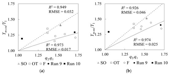 A total of eight experiments were conducted for this research and the experimental conditions are summarized in Table 1 where Q is the total discharge and q2/q1 is the discharge contraction ratio which can be used as a key-independent variable that accounts for flow redistribution and resulting flow acceleration through a bridge section. V1, Y1, and V2, Y2 are cross-sectional mean velocity, and depth of floodplain in the approach and at the upstream face of the bridge section, respectively. Also, maximum scour depth expressed as flow depth measured at the location of maximum scour (Ym) and longitudinal (flow direction) distance measured from the upstream face of the bridge to the location of maximum scour depth (X) (see in Figure 2a) are presented in Table 1. A better idea of the scour distribution at the bridge cross section in these experiments can be seen in Figure 6 as a reference. Run 9 and 10 were selected from the previous study [25] and used to validate the results in this research so that the suggested method can be used for different hydraulic and geometry conditions. As shown in Table 1, runs 1, 4, 5, and 6 were performed in free (F) flow condition; whereas, the remaining runs were conducted in the submerged flow conditions with overtopping (OT) and without overtopping (SO).