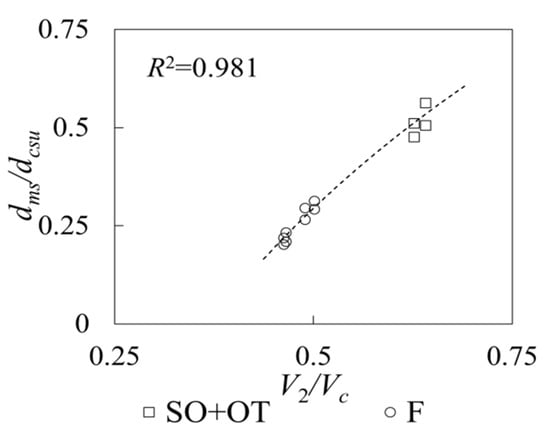 It is interesting to note that, the regression analysis results using only with the data set in Figure 4 show higher values of exponents of q2/q1 in the case with the M/S pier scour equation for both of the pressure and free flow cases. This finding illustrates that the M/S equation shows a smaller value of pier scour depth in the same flow conditions compared to the CSU equation. The ratios between the theoretical pier scour depths calculated using CSU (dcsu) and M/S (dms) are plotted with the value of flow intensity factor (V2/Vc) in Figure 5. As shown in Figure 5, the M/S equation shows almost 50% to 75% underestimated values compared to the CSU results. The CSU pier scour equation was developed for live-bed scour and thus ignores the effect of different values of flow intensity and assumes the value is equal to 1; but in the M/S equation, V2/Vc is considered as an individual factor to account for the effect of clear water conditions and varies from 0.3 to 1. So, it is obvious that the CSU pier scour equation shows a larger value when applied to the clear water condition. However, there is another important difference between the CSU and M/S equations, which is the consideration of bed material size. However, in our case, the effect of sediment size cannot be considered because all of the experiments are conducted with same sediment size.