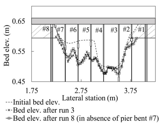 In addition to suggest a comprehensive procedure, the effect of pier bent (located near to the abutment) on maximum scour depth was investigated qualitatively. As shown in Table 1, runs 7 and 8 were conducted with the exact same flow condition as in runs 2 and 3 respectively, but removing pier bent #7 in the bridge section. Figure 6 shows the cross-section comparisons between runs 3 and 8 after scouring. The maximum scour depth occurred at pier bent #6 for both runs 3 and 8. So, the location was independent of the presence of the closest pier bent (#7). However, the amount of maximum scour depth was slightly higher in the case of run 8 where pier bent #7 was absent. A similar trend was observed for runs 2 and 8. Discharge redistribution over the time and interaction between each pier can be the result for this difference of maximum scour depth and needs further study.