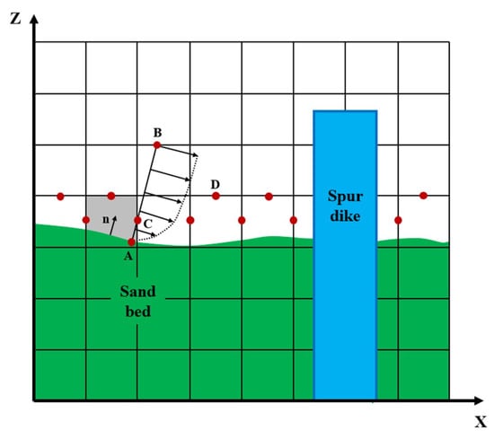 Considering a cell marked in the gray color in Figure 2 and the normal vector of bed surface is n, the line paralleling with n passing through C point intersect the bed at point A point while intersecting the upper cell at point B. The velocity vector at point B tangential to the bed slope of gray cell can be obtained by distance-weighted interpolation among the nearby cells on which the flow velocity is solved by NS equations. With the help of the wall functions above, the friction velocity at point A can be calculated, then the shear stress is obtained, in the process of which, the velocity vector at point C can also be reconstructed for the momentum equations.