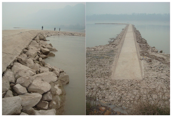 In this study, the Yangliuqi reach of the Yangtze River is selected, which is located at 1017.8 km of the navigation waterway between Hejiangmen, Yibin City and Naxi, Luzhou City. The reach is transitional shoal, and the channel bed consists of red sandstone covered by cobbles and boulders. The double spur dikes (Figure 3) were constructed on this reach in 2011, and therefore two different kinds of engineering cases are taken into consideration with the terrain contours from field measurement shown in Figure 4 and Figure 5.