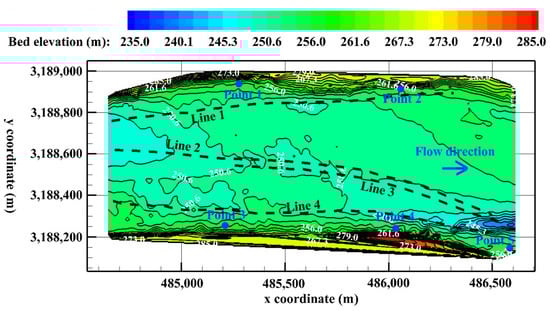 Terrain contours of the target reach before the spur dikes’ construction (the datum is the sea level, and gray dashed lines and blue dots show the locations of flow velocity and water elevations being observed).