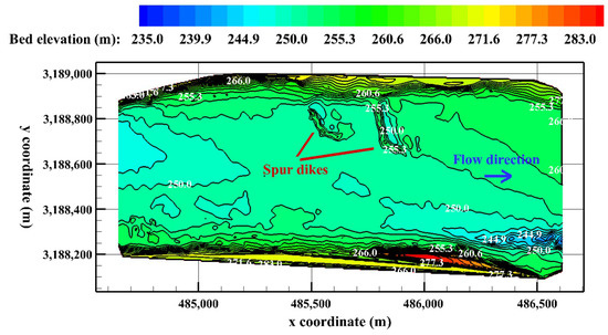 Terrain contours of the target reach after the spur dikes’ construction (the datum is the sea level, and the double spur dikes were built at the left bank around the middle position of the reach).