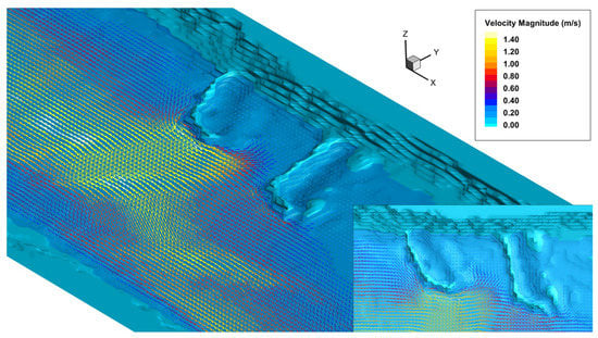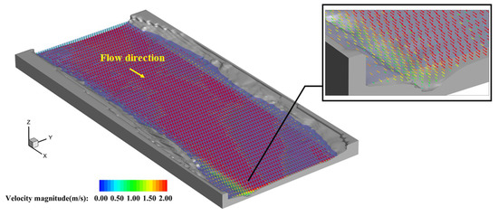 The flow discharge and water elevation of Case No.2 in Table 1 are taken as the initial flood conditions. After obtaining the equilibrium state under this condition, the flow field of the target reach is shown in Figure 8 and Figure 9. It can be found that the flow velocity of the main flow is much larger than that of the circumfluence zone behind the spur dikes, which is mainly due to the shelter effect of the structures. The double-spur dikes narrowed the river flow width and induced water to move along the main navigation channel, which makes the reach more navigable. Under this flood condition, the double-spur dikes’ tops are still above the water level, and therefore this is called the “non-submerged condition”.