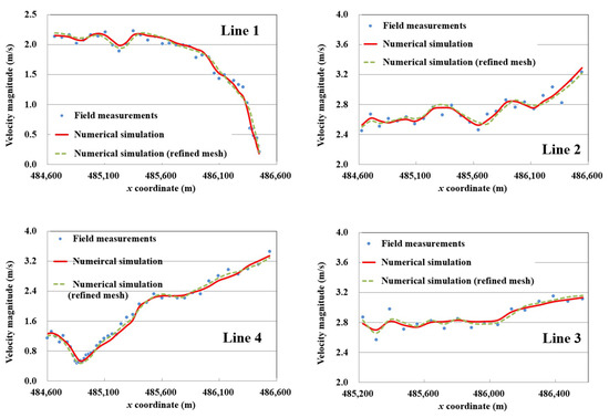 After the dynamic equilibrium state is obtained, 200 s time-average windows were conducted for the numerical results; then, the velocity magnitudes along four lines and water elevations at five selected points are compared to the measurement data in Figure 7 and Table 2. From this it can be concluded that the performance of this model is essentially invariant under the two different mesh systems, suggesting this model can accurately reproduce the flow field and the variation of water surface under the specified flow condition, and that good agreement can be obtained in comparison with field measurement, while the relative errors of the flow velocity and water elevation are less than 9.6% and 9.9% for the coarse mesh, and 9.9% and 11.7% for the refined mesh, respectively (dimensionless by water depth).