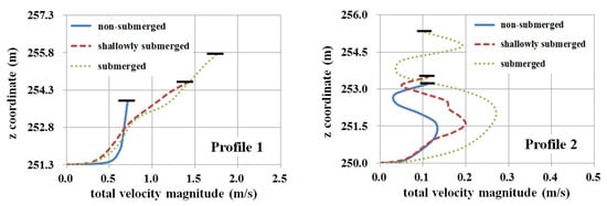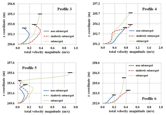 To better understand the local flow characteristics around the spur dikes during the whole flood process, six spots are selected (Figure 9), on which the vertical velocity profiles of these three conditions are extracted from flow field data and plotted in Figure 10. Differences can be found between these velocity profiles temporally and spatially, which proves again the flow separation and circumfluence result in strong 3D turbulence around these spur dikes. Compared to the vertical velocity profiles in “non-submerged condition”, the overtopping flow in “shallow submerged condition” makes the vertical velocity profiles begin to show the shape of double crests, which can be seen clearly in Profile 1, Profile 4 and Profile 5. When the “submerged condition” is obtained, we can find that at the locations of Profile 2 and Profile 5, which are very close to these spur dikes, the velocity magnitudes at the upper region of the whole flow depth have already achieved relatively large values due to the overtopping flow, and their values are comparable to or even larger than those of the bottom region caused by the circumfluence vortex.