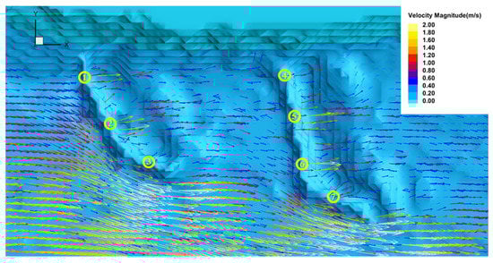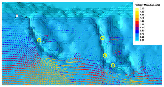 According to the field observation and corresponding flume test of the target reach (Jia and She et al., [43]), the double-spur dikes are vulnerable in the “shallow submerged condition” and “submerged condition”, and the phenomena of collapse always show, which are directly caused by the intensive overtopping flow. To find the potential damage positions and offer guidance for engineering reinforcement, the 3D flow fields of these two conditions are plotted in Figure 11 and Figure 12, and the depth-averaged velocity magnitude of the overtopping flow is calculated. The positions with relatively large values in these two figures are highlighted with numbered yellow circles, which are also listed with their velocity magnitudes in Table 3 and Table 4.