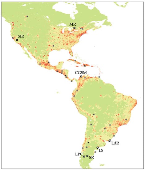 To explore the variation in threats to FWES across the Americas we selected 32 sites in 23 nations from the international Convention on Wetlands (www.ramsar.org, Figure 1 and Table A1), including a mix of lakes, rivers and wetlands. The 32 sites included three sites each from larger nations with heterogeneous climate and population distributions (Canada, USA, Brazil), two sites from medium-sized nations (Argentina, Chile, Mexico), and one site from each of 17 smaller nations in Central and South America. Several smaller Caribbean nations were omitted because they lacked Ramsar sites, or indicators needed for the analysis were unavailable. We used the Ramsar sites to extract threat estimates from a global FWES threat dataset (Section 2.2), then used those results to diagnostically assess the international coordinated research effort “Sensing the Americas’ Freshwater Ecosystem Risk from Climate change” (SAFER Project, www.safer.conicet.gob.ar). The SAFER research network includes seven aquatic sites (rivers, lakes, and coastal lagoons) located in six nations (Figure 1). SAFER sites were selected mainly because they were sites of ongoing investigations by SAFER researchers and allowed the SAFER network to leverage prior work and additional funding. In this work, we examine their potential for exploring socio-environmental gradients to improve the understanding of FWES threats.