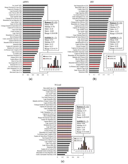 The nutrient regulation threat benchmark (N-load) for the Ramsar sites (Figure 3c) ranged from 0.29 to 0.85, with a slightly lower average (0.58) than the other two benchmarks. The Ramsar N-load values were normally distributed (skewness = −0.02). The SAFER site values were skewed toward the intermediate and high threat portions of the range, but fail to appear in the lower portion.