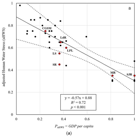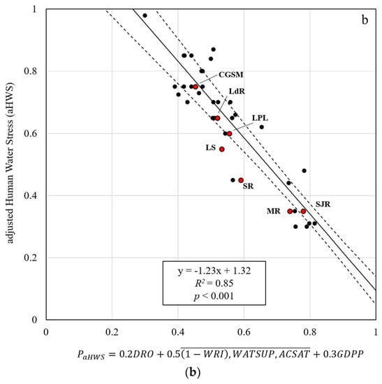 Regression analysis for ecosystem service water supply benchmark aHWS (adjusted Human Water Stress; []) as a function of proxy (PaHWS) obtained using external, internal and socioeconomic indicators (Table 2): (a) regression results for GDPP as single proxy, and (b) best regression results for three-category proxy. Regression models (solid line; dashed lines 95% confidence interval) based on Ramsar sites (black circles), with SAFER sites (red circles) plotted for comparison.