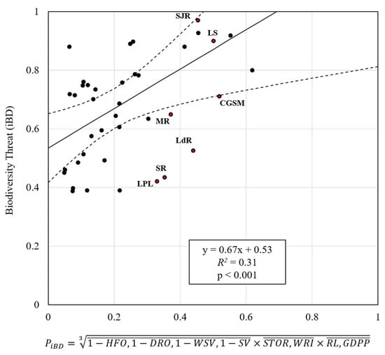where is the average of all four of the hydro-climate (external) proxies, is the average of the watershed storage and water return (internal) proxies, and is the average of the Rule of Law and GDPP (social) proxies. The regression slope is positive, meaning that any increase in PiBD predicts an increase in the threat to biodiversity.