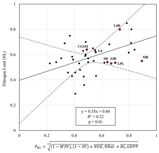 Regression analysis for ecosystem services provided by ecosystem nutrient regulation service threat benchmark N-load (NL; []) as a function of proxy (PNL) based on external, internal and socioeconomic indicators (Table 2). Regression model (solid line; dashed lines 95% confidence interval) based on Ramsar sites (black circles), with SAFER sites (red circles) plotted for comparison.