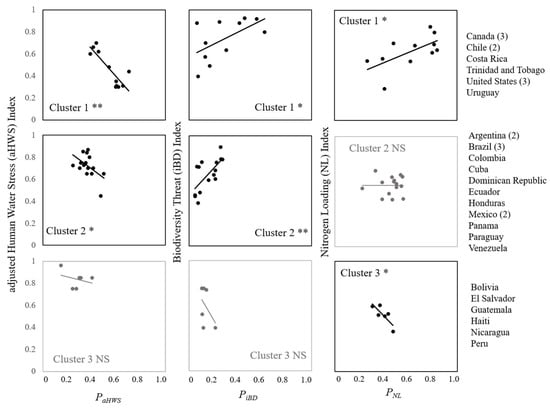 | Cluster 2 | Argentina (2), Brazil (3), Colombia, Cuba, Dominican Republic, Ecuador, Honduras, Mexico (2), Panama, Paraguay, Peru, Venezuela | aHWS iBIO NL | −0.82 1.20 0 | −0.51 0.68 0 | 0.05 <0.01 NS |