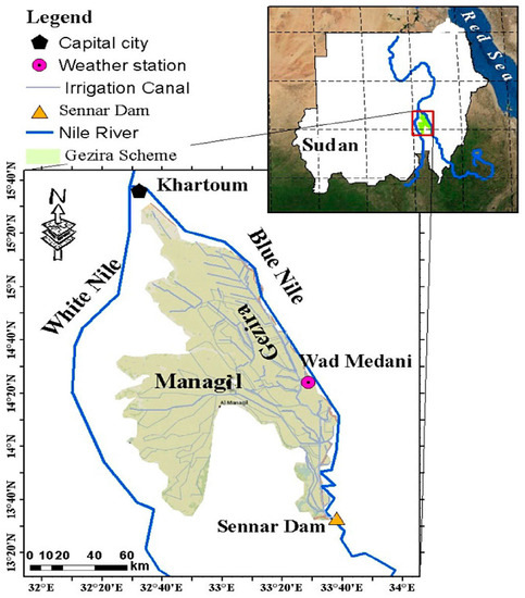 The Gezira Scheme is located between the Blue Nile and the White Nile Rivers to the south of the capital Khartoum in a semi-arid zone (Figure 1). The early start of the scheme was in 1911 when an experimental farm was established at Tayba village on the west bank of the Blue Nile. The scheme is one of the largest irrigation schemes in the region, comprising 880,000 hectares (ha) [12]. Each farmer has 8.4 ha (as average) divided into 4 plots; the farmers’ main crops are cotton, wheat, sorghum, groundnuts, and vegetables [22].