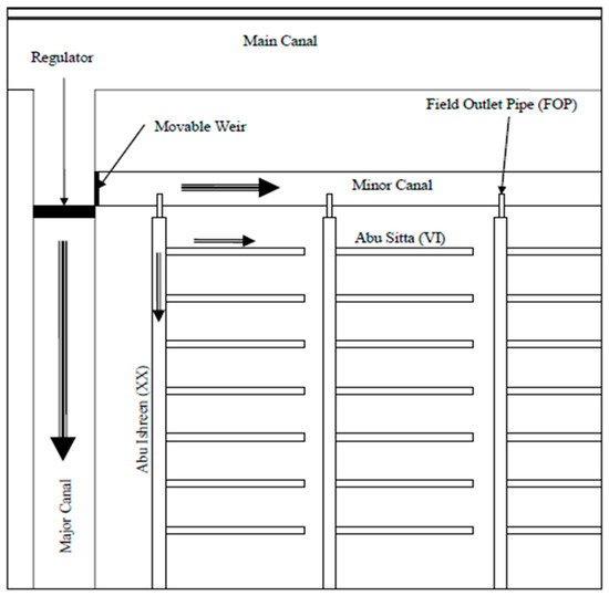 The irrigation system consists of two main canals running from Sennar Dam; the Gezira canal with a capacity of 168 m3/s and the Managil canal with 186 m3/s [17,24]. Figure 2 below shows the main canal, which delivers water to Major canals. Then, water is conveyed to minor canals with determined and fixed levels; these levels are used to ensure equity in distribution at field canals (Abu Ishreen). The internal canals (Abu Sitta) are used by farmers to irrigate their farms.