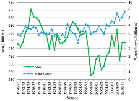 For the different management periods, the irrigation water requirements were calculated by both CWR and Indent methods considering the seasonal variation in the cultivated areas. Figure 3 represents the seasonal water supply and cultivated area for the Gezira scheme. It was observed that, during the last two decades, there is a significant decrease in the cultivated area; nevertheless, the water supply conversely keeps growing. The analysis of water supply and cultivated area data is shown in the next part.