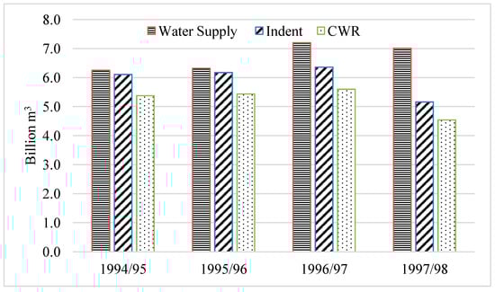From the chart, in the 1998/99 season, the water supply volume increased by 2.63 billion m3, and continued growing to reach 2.73 billion m3 by 2002/03. In the seasons of 2003/04 and 2004/05, the excess water had reached 2 and 2.48 billion m3 respectively. In general, it seems that over the seven seasons, the water supply was much higher than the Indent and the CWR.