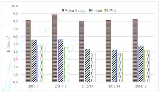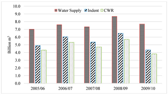 According to the graph (Figure 7), the water supply volume was higher than the Indent value, for the seasons 2005/06, 2006/07, 2007/08, and 2008/09, where the excess water had reached 2.12, 1.56, 1.98, and 2.2 billion m3 respectively. In the 2009/10 season, the water supply volume increased dramatically by 3.362 billion m3, which represents an increase of 102% for Indent and 78% for CWR values.