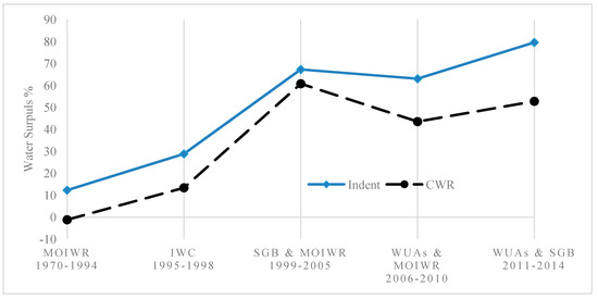 From the chart, it is clear that during the MOIWR period, the water surplus values were generally about the reference values, with average water surplus of 12% for Indent and 1% for CWR. For the other periods of (IWC), (SGB & MOIWR), (WUAs & MOIWR), and (WUAs & SGB) the average water surplus was 29%, 67%, 63%, and 80% for Indent and 13%, 61%, 44%, and 53% for CWR respectively.