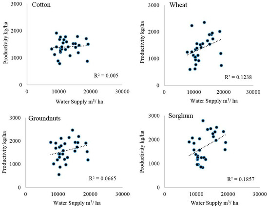 Figure 10 shows the relationship between water supply per hectare and crop productivity at the Gezira scheme. It is noted that, for all crops, the correlation values are very low (R2 values: 0.005, 0.1238, 0.0665, and 0.1857 for Cotton, Wheat, Groundnuts, and Sorghum respectively). This indicates that the relationship between excessive water supply and crop productivity is weak, and hence, intensive water supply was not valuable for crop production.