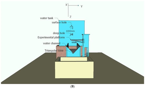 The experiment was conducted in the State Key Laboratory of Hydrodynamics and Mountain River Engineering in Sichuan University. Figure 2 shows the schematic diagram of the model test. The water flux was supplied by a large rectangular tank (width of 4.0 m, length of 4.0 m, and height of 5.0 m). When laying the rainfall receiving platform, we considered the symmetry of the surface and deep hole, and only one side was arranged. Water was fed into the iron box through the pump behind the iron box, and the water level of the iron box was maintained through the valve in order to achieve a stable deep and surface flow.