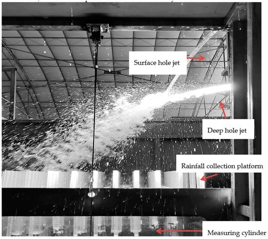 Rainwater was collected in the horizontal plane (xy plane in Figure 3) at the different elevations below the collision point and 0.15 m above the faceplate. The rainfall collection platform included the movable base, support, and rainfall collection panel, which was made of an organic glass panel and a PVC pipe. In each plane, up to 121 PVC pipes (each with a diameter of 2.0 cm) were used simultaneously to collect rain within a period varying from 60 s to 1000 s, depending on the rain intensity in that region, which was found to be sufficient to ensure stable results. Zhang and Zhu [] indicated that the measurement error could be ignored with different pipe diameters. In their test, the bottles (25 mL with a bottle-neck diameter of 1.52 cm) were tested to give the same (3% difference) result of rain intensity distribution as those of much larger plastic bottles (250 mL with a bottle-neck diameter of 3.26 cm). To avoid the impact of water splashing on the back of the faceplate, the faceplate was hollow, except for the holes and supporting frames. The lower end of the short pipe, whose range was 15~3000 mL, used a measuring cylinder to collect rainfall. Rainfall intensity varies from point to point, so different cylinders were used. To obtain the whole region’s rainfall intensity, the platform was first placed in one region to collect rainwater, then the entire platform was moved 1.2 m in the longitudinal direction to the next region. To ensure measurement accuracy, two measurements were made in the same working conditions, and the average was taken.