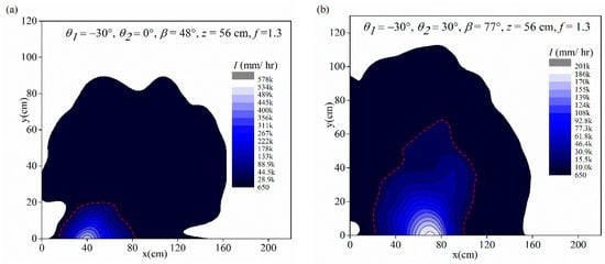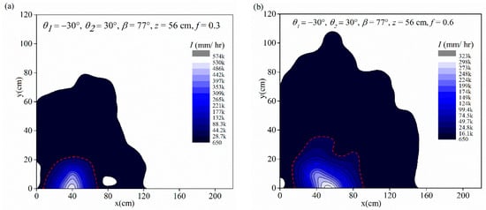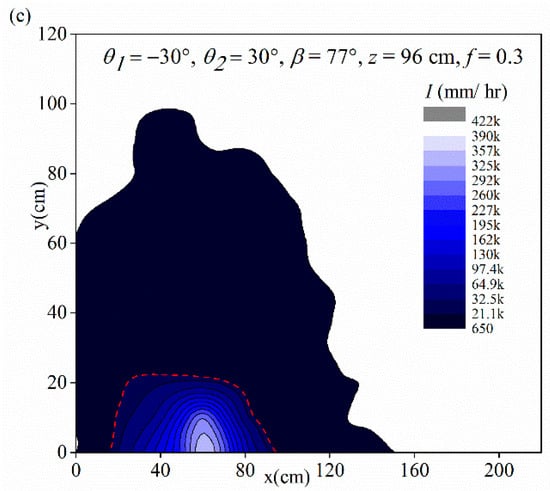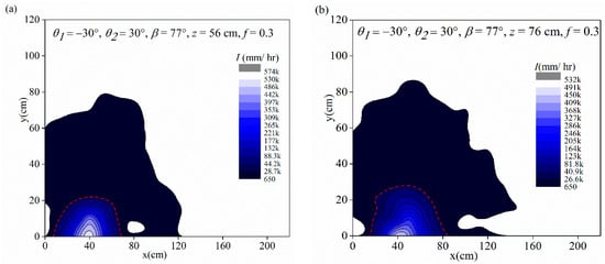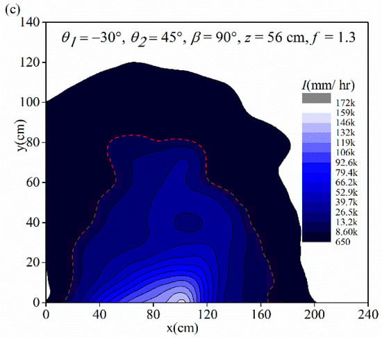 Figure 4, Figure 5 and Figure 6 show the distribution of rainfall intensity for several flow ratios, collision angles, and heights of the rainfall intensity collection platform from the collision point. The rainfall intensity boundary defined 5% of the maximum rainfall intensity under each working condition [].