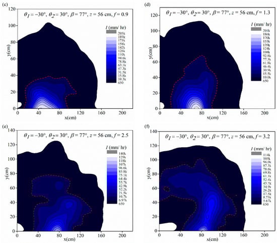 In Figure 4, the flow ratios vary, and the height and collision angles from the collision point to the measurement platform are constant. Note that on the section with the same vertical distance from the collision point, the rainfall intensity range showed an increasing trend on the y-axis when the flow ratio increased. On the x-axis, the rainfall intensity range increased first, and subsequently decreased slowly. For f = 0.3, the rainfall intensity range was concentrated in the range 0 cm ≤ x ≤ 22 cm; for f = 0.9, the rainfall intensity range was concentrated in the range of 10 cm ≤ x ≤ 100 cm; while when f = 3.2, the rainfall intensity range was concentrated in the range of 40 cm ≤ x ≤ 115 cm. Under all of the working conditions, the maximum rainfall intensity was on the x-axis.