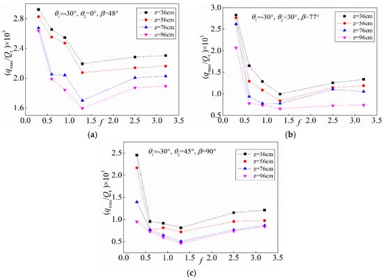The maximum rainfall of each section (qmax) is shown in Figure 7. Note that (1) the maximum rainfall intensity decreases with an increase in distance of z, (2) qmax sharply decreases for f < 1.4 and slightly increases for f > 1.4, and (3) the results indicated that qmax decreases with an increase of β. In Figure 7a,c, for f = 1.3 and z = 96 cm, qmax/Qt × 103 = 1.6 at β = 48°, while qmax/Qt × 103 decreased to 0.45 at β = 90°, where Qt is the sum flow discharge of surface hole and deep hole outlets.
