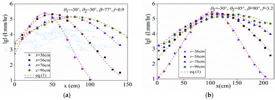 Rainfall intensity distributions along the x-axis and comparison with Equations (1) and (2). (a) θ1 = −30°, θ2 = 30°, β = 77°, and f = 0.9; (b) θ1 = −30°, θ2 = 45°, β = 90°, and f = 3.2.